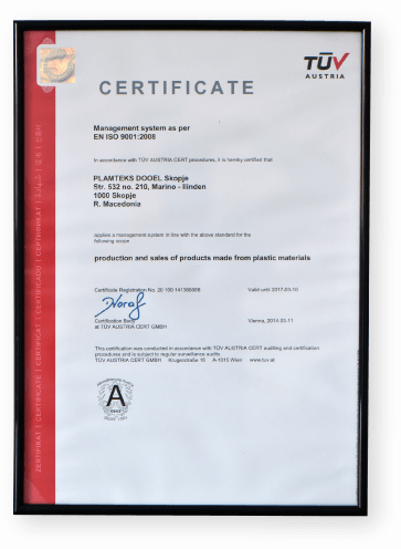 „Пламтекс“ доживува преродба со системот за управување со квалитет. Како резултат на континуираната посветеност во обезбедување на технички ткаенини со највисок квалитет, „Пламтекс" се здобива со сертификат ISO 9001:2008 за својот систем за управување со квалитет.